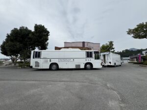 グループのコンベンションホールにて、朝から設営して頂き各社社員が順次ホールにて。